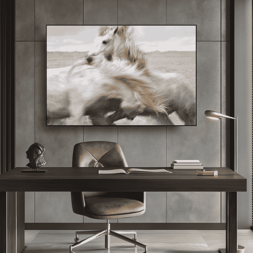 Offices and Workspaces: Studies show that nature-themed art can help reduce stress and boost creativity. A horse art print like “Elegant Spirits” is a great addition to your office, offering a calming yet motivational atmosphere. Its timeless beauty will inspire both creativity and focus throughout your workday.
